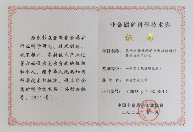 近日,中国非金属矿工业协会发布了2025年度“非金属矿科学技术奖”获奖项目名单,由新疆农业大学化学化工学...