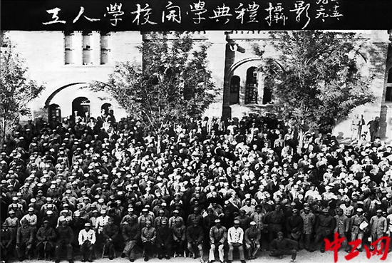 为培养大批干部,中央决定成立延安工人学校。图为1939年5月,该校举行开学典礼时的合影。